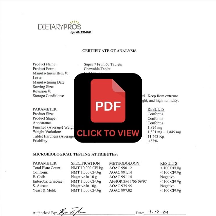 Super7™ is a delicious, nutrient-packed chewable featuring seven powerhouse superfruits: Amalaki, Acai, Goji, Mangosteen, Pomegranate, Blueberry, and Cranberry. This potent blend delivers essential vitamins, antioxidants, and enzymes to support immune health, energy, and overall wellness. Together, these superfruits work synergistically to give your body a natural boost of vibrant nutrition—anytime, anywhere!